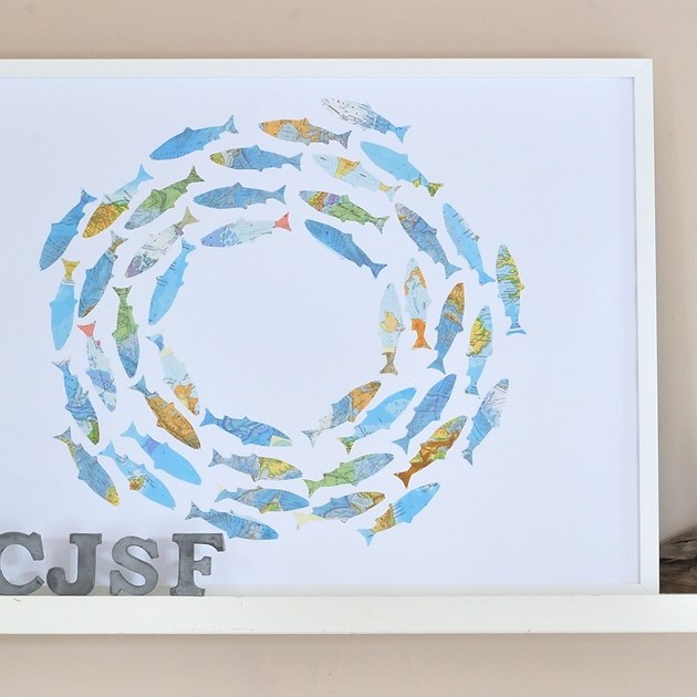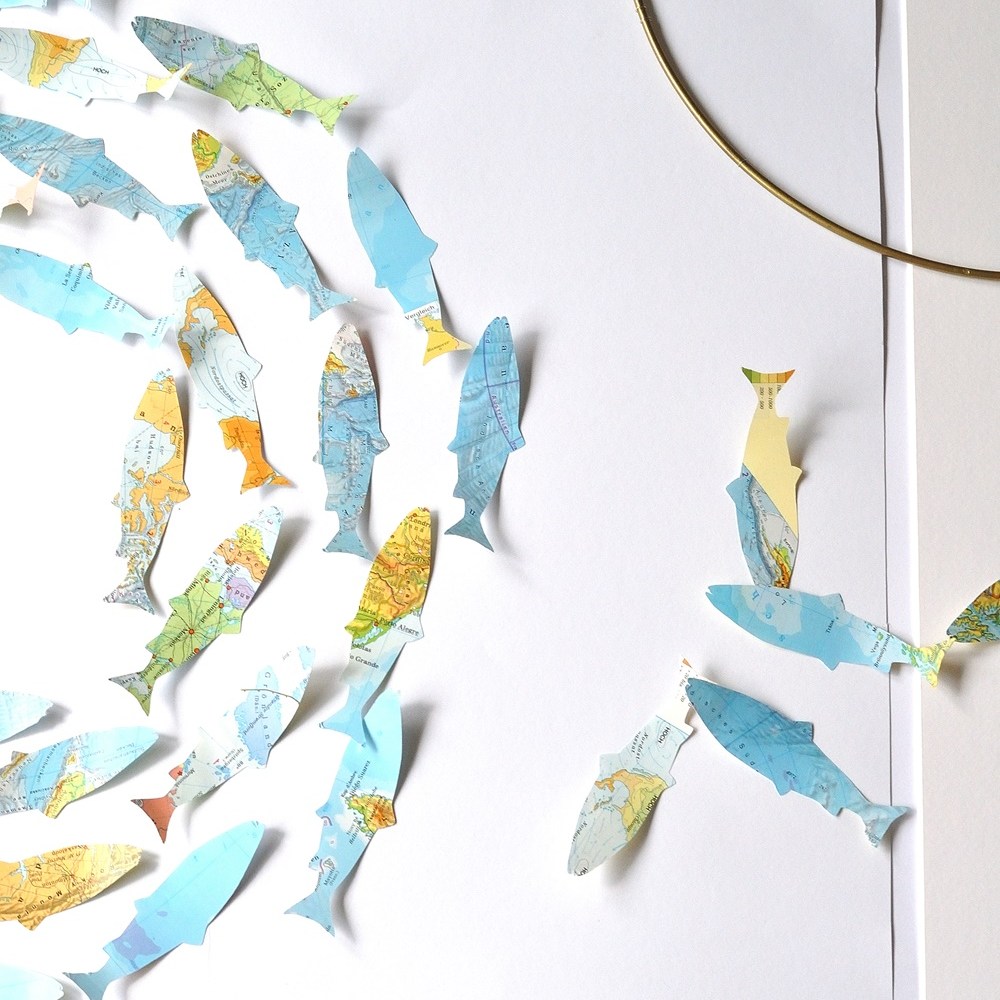A végére pedig egy igazi upcycling darab, vagyis nem éppen a funkciója szerint hasznosítjuk a dolgot, de ettől még izgalmasabb. Egy régi atlasz kelt új életre, most éppen halak formájában. Egy képkeretbe került és a nappali, nyári tengert idéző éke lett.