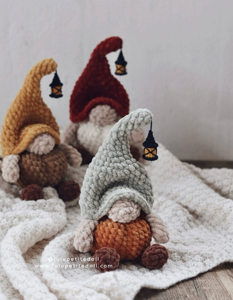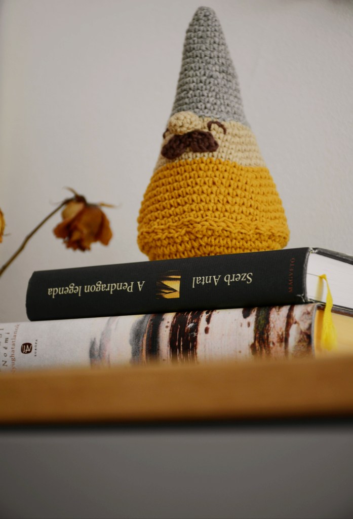 A manó mintája itt található, a “Gnomer” szóra kattintva letölthető. Mivel dánul van, én kerestem mellé kapaszkodót, az ő mintája szinte ugyanaz. Kihagytam egy két lépést, mert kisebbet szerettem volna. De a kész manó így is jól sikerült.