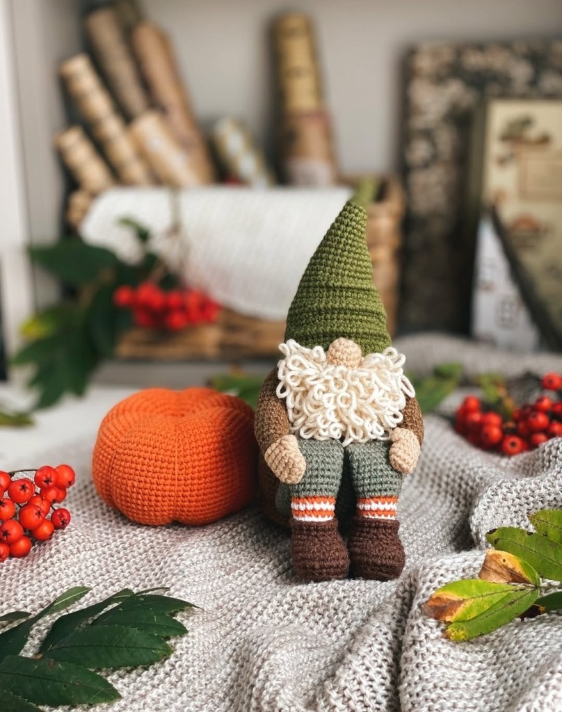 A mai választásom erre a manóra esett, minden évszakhoz lehet igazítani a színvilágát. Kicsit, olyan kedves öreg uras lett, pláne ezzel a bajusszal. Az eredetiben nincs bajusz, ez egy kis ráadás, így minta sincs hozzá, én egy videó alapján csináltam, igazodva a manó elvárásaihoz. Egyébként egy falevél/szirom mintája kicsiben.